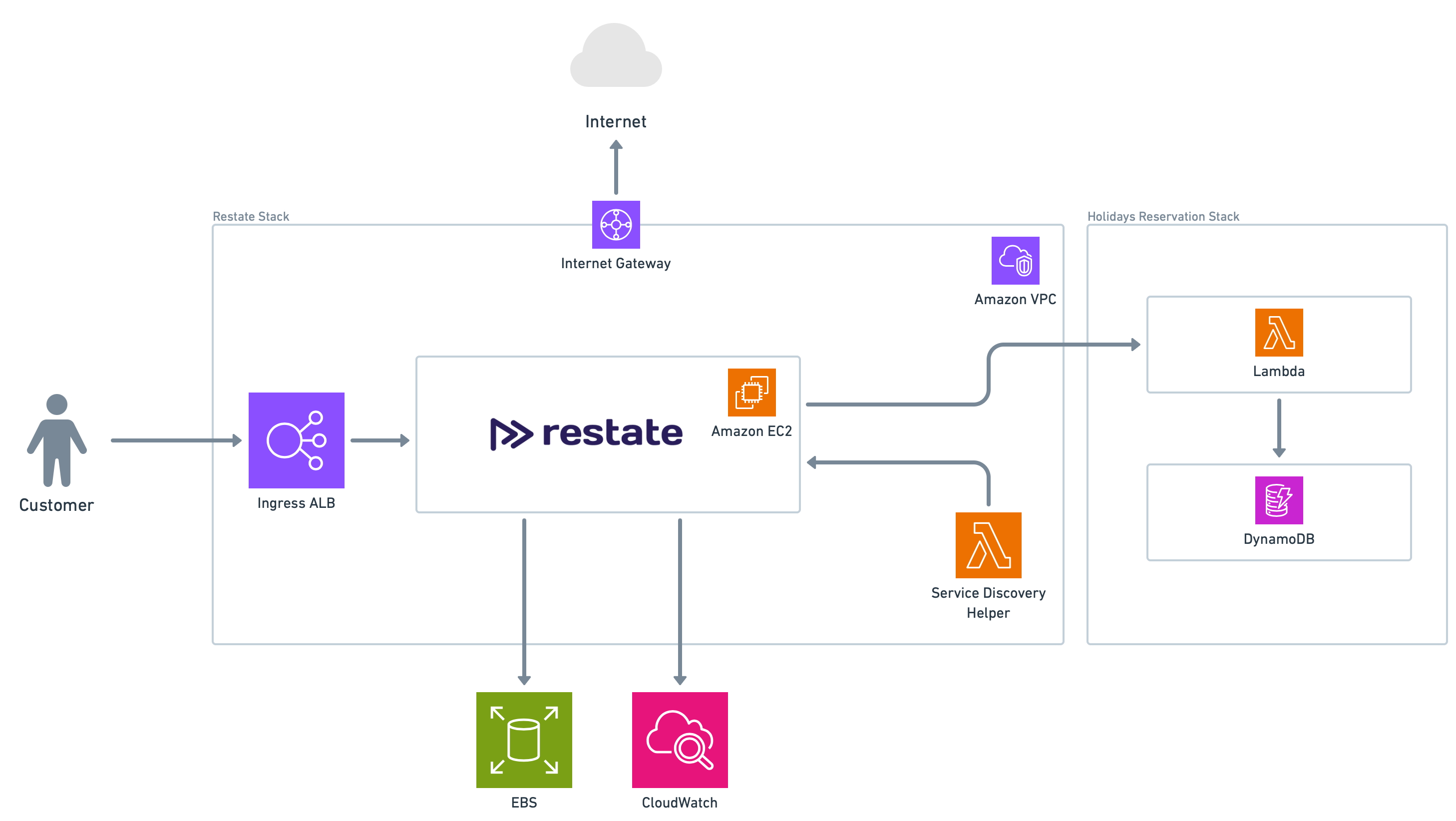 This project contains two separate CloudFormation stacks: with a Restate container in a dedicated VPC, and all the Lambda handlers that make up the Reservations service in a separate stack.
