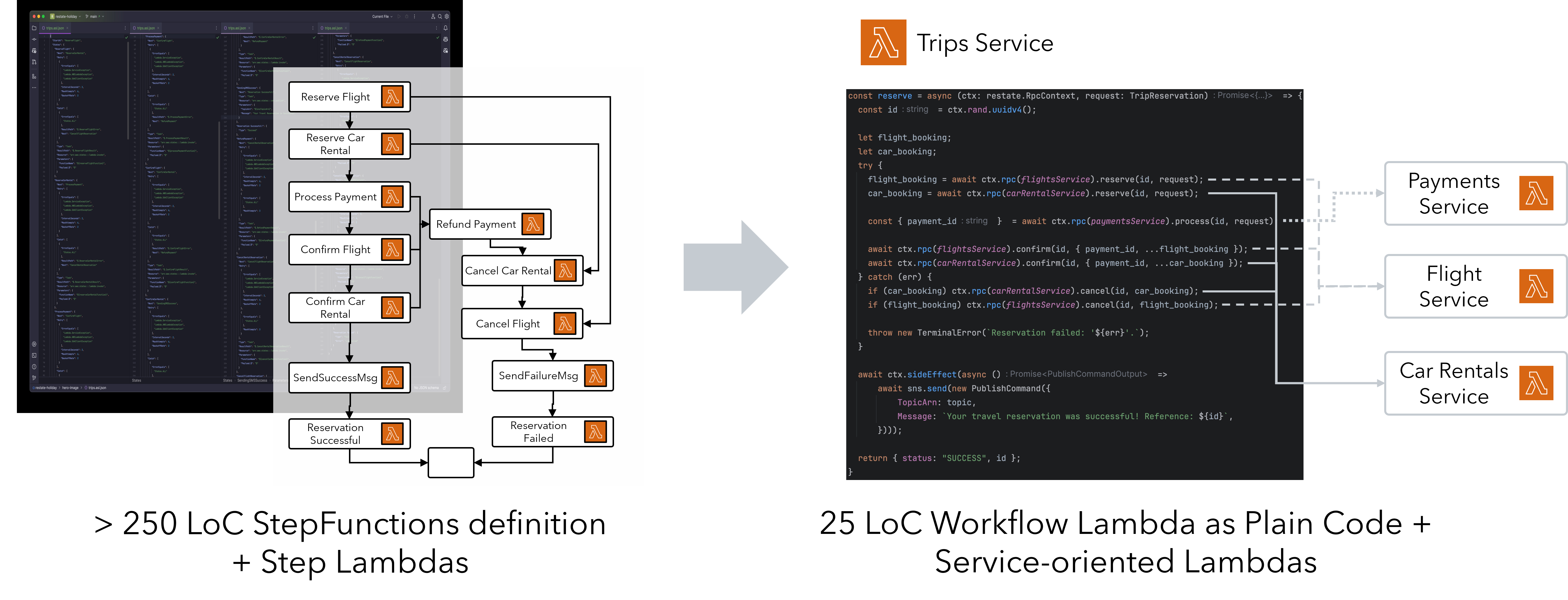 tl;dr: We show you a new way to build complex business processes on AWS Lambda, where you can do everything with sequential code and RPC-style service calls, no workflow DSL or plumbing events. You can write code the same way you’d write outside of Lambda, but with all the benefits of Lambda for operations and cost, and the reliability of Step Functions and event-driven apps. This is possible because we make Lambda functions suspendable, using durable async/await, implemented by our open-source runtime, Restate.