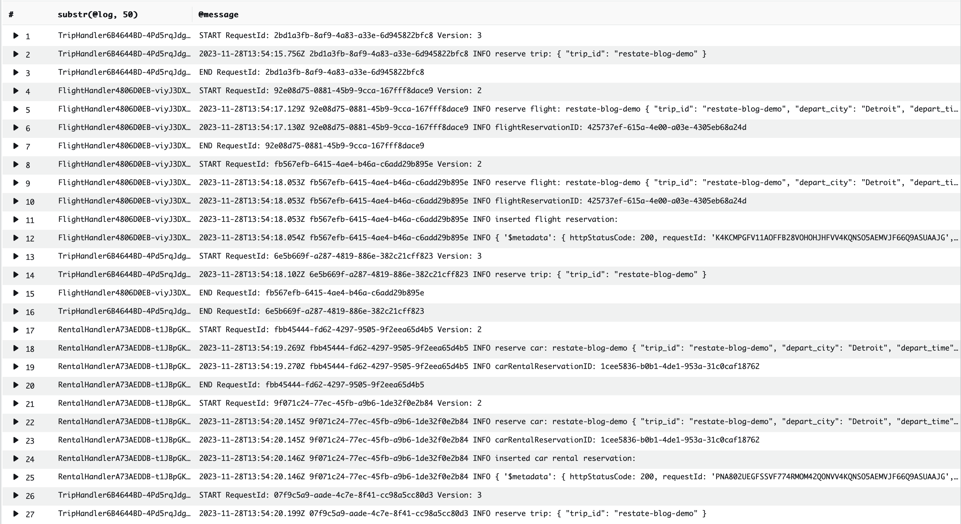 Let’s take a closer look at what really happens with the underlying Lambda handlers when we make an invocation to the Trips Service. Using CloudWatch Log Insights, we can query across all four handlers’ log groups: