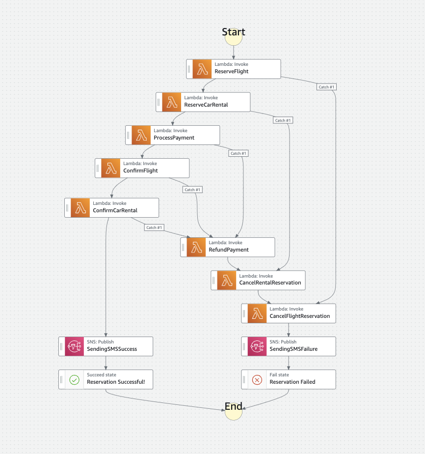 AWS provides an excellent demonstration of this pattern in the Serverless Sagas example, with Step Functions taking the role of reliable executor. In the example scenario we implement a service that takes bookings for holiday trips. It needs to book a flight, reserve a rental car, process a payment, and then issue a confirmation. If any of these steps fails, the system must roll everything back; refund the payment and cancel any reservations. In the AWS example, each operation on flights, cars, and payments is implemented as a small Lambda handler. The overall business process is captured as a Step Functions workflow, which defines the sequence of operations. It is responsible for accumulating progress as we go through the steps, as well as for retries and rollback.